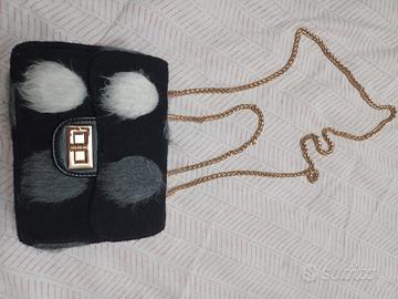 Borsa a tracolla, perfetta per completare un outfit invernale o aggiungere un tocco sbarazzino e chic al tuo stile. Tessuto effetto lana/feltro, molto morbido e caldo al tatto. Fantasia a pois/macchie tonde in contrasto bianco e grigio su base nera.