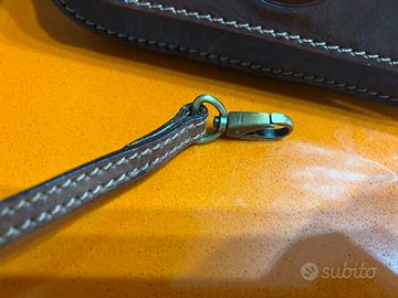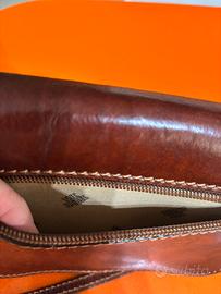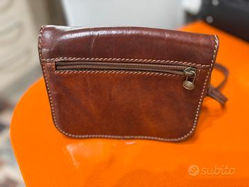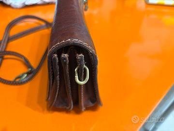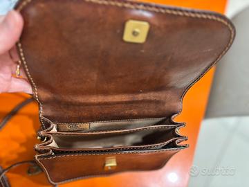 Borsa in pelle marrone chiusa con pattina e clip magnetica. Interno sfoderato a scomparti, tracolla non regolabile. Ottimo stato