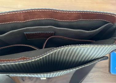 Borsa uomo a tracolla marca The Bridge, in tessuto poliuretano stampa The Bridge con rifiniture in pelle e tracolla in tessuto di cotone.