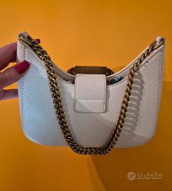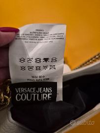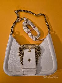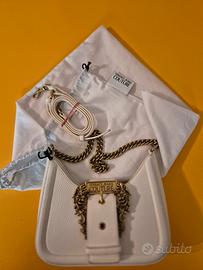 Borsa a tracolla donna Versace Jeans Couture bianco, taglia unica, tracolla bianco regolabile e manico con catena oro, fibbia oro e chiusura con magnete, interno con fodera nero, dimensioni lunghezza 21 cm altezza 17 cm e profondità 6 cm. Molto bella e nuova con dust bag, senza cartellino, mai usata.