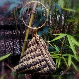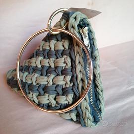 Borsa a triangolo all'uncinetto in fettuccia di cotone, con manico in metallo, fatto a mano. Lati 19cm, diametro anello cm 12,chiusura con cerniera