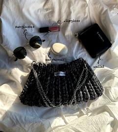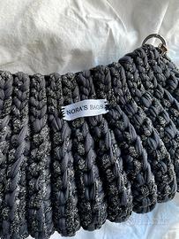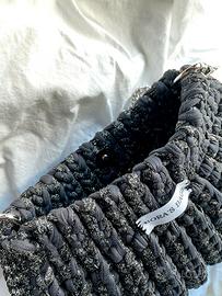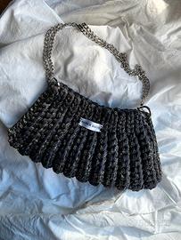 una borsa realizzata con fettuccia grigia e cordino lurex per dare un tocco di eleganza in più. Perfetta per le tue serate e distinguerti dagli altri.