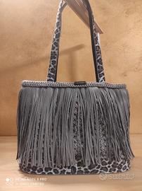 borsa a uncinetto con manici e fondo leopardato frange in ecopelle foderata