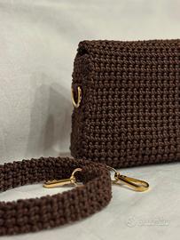 Borsa ad uncinetto fatta a mano, dettagliatamente rifinita, di colore marrone con dettagli dorati (chiusura a scatto e moschettoni).