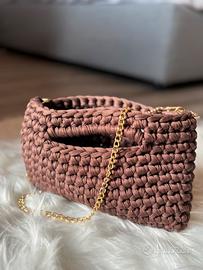 Clutch bag interamente realizzata a mano personalmente ad uncinetto in morbida fettuccia di marrone con catena dorata. Scrivimi per informazioni!