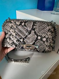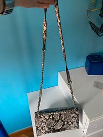 Borsetta in eco pelle a tracolla a catena, che se raddoppiata si può portare a spalla. Chiusura con gancio, targhetta, interno doppio. Taschino interna con zip, due vani interni. In ottima condizione.