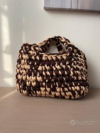 Borsa fatta a mano all’uncinetto, realizzata da me interamente in fettuccia di lycra, nei toni beige e marrone.
