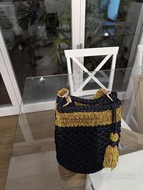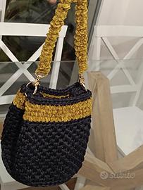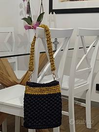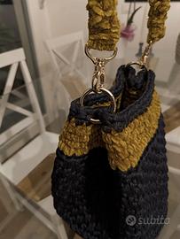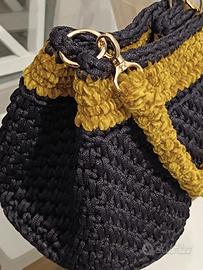 Borsa nuova interamente realizzata a mano all'uncinetto con fettuccia di alta qualità colore blu notte e ciniglia vellutata senape. Nappina removibile.