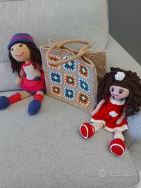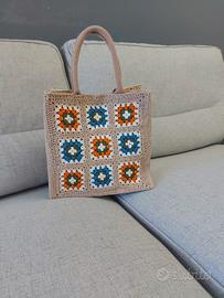 Borsa in iuta rivestita con mattonelle granny in cotone 100% certificato, misura 30×29×18 ...chiusura bottone magnetico , tasca interna per il cellulare...interamente fatta a mano
