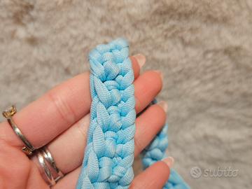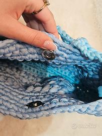Borsa Azzura e blu cobalto in Lycra , fatta a mano all'uncinetto. Chiusura a bottoncino e manico fatto all'uncinetto con fiocchetti per decorazione (i quali si possono togliere) e molto capiente.