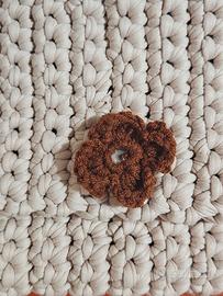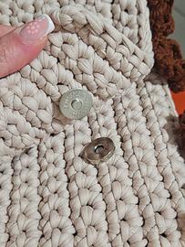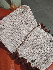 Borsa beige con ricami marroni e fiori marroni all'uncinetto fatta a mano da me. Morbida, capiente e molto elastica con chiusura a bottoncino e ganci integrati con catenella argento.