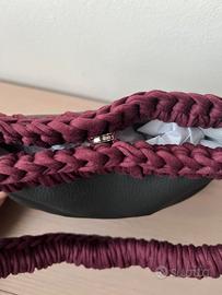 Borsa fatta a mano all’uncinetto, realizzata da me con base in ecopelle nera e dettagli in filato di cotone riciclato color bordeaux.