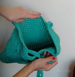 borsa all'uncinetto lavorazione a rete in cordino con tasche frontali in cordino color tiffany