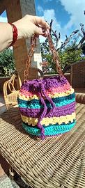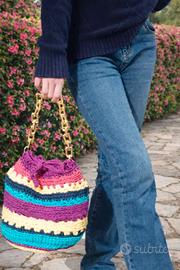 Cerchi una borsa che nessun’altra avrà? 🌈 Questa è 100% handmade, colorata, originale e super versatile. Perfetta per dare carattere anche all’outfit più semplice. Chi la sceglie ama l’artigianato, i dettagli e l’unicità 💜 Borsa fatta a mano per hobby.Modello a secchiello con catena color oro. Dimensioni: altezza 23 cm, larghezza 21 cm.