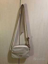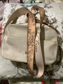 Borsa a tracolla in tela beige chiara , ottimo colore neutro , la tracolla ha il disegno classico di Alviero Martini, ha una zip di chiusura e una zip frontale, capiente e leggera , ottimo stato.