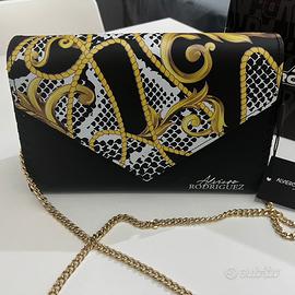 Colore nero, con stampa floreale oro, come da foto. Inclusa catenina colore oro per essere portata a spalla.