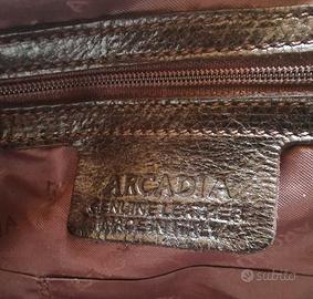 Pelle autentica Full Grain Genuine Leather verniciata, marrone scuro, Arcadia autentica al 100%. Le borse in vernice Arcadia sono l'esempio perfetto dello stile e della qualità dei veri prodotti Made in Italy. Elegante colore Marrone Scuro. Chiusura superiore con cernieraCerniera su una parete frontaleDivisorio centrale con cerniera e 2 tasche interne. Fondo, piedini protettivi in metallo Bellissime condizioni! Difficile rilevare che sia stato usato internamente ma dai piccoli dettagli esterni.