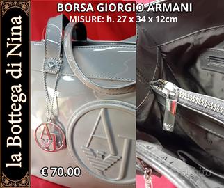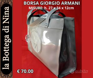 Borsa shopper Armani Jeans in vernice argentata, struttura rigida con manici doppi. Logo AJ in rilievo sul fronte, charm metallico con logo incluso. Interno in tessuto jacquard con monogramma Armani, tasca interna con zip e cursore firmato con aquila Emporio Armani. Ottime condizioni, praticamente nuova. Dettagli: Misure: 27 x 34 x 12 cm. Marca: Armani Jeans (AJ) Colore: Argento / Silver Materiale: Vernice (PVC lucido) Interno: Tessuto jacquard logato, fodera nera Chiusura: Aperta superiormente + tasca interna zip Accessori: Charm a pallina con logo AJ Condizioni: Ottime