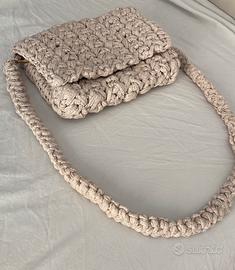 Borsa artigianale all’uncinetto in fettuccia di cotone beige, con tracolla intrecciata e lavorazione a maglia larga. Stile boho, ideale per look casual.