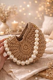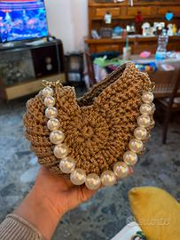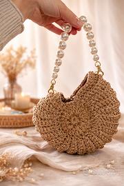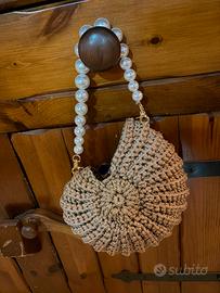 Elegante borsa realizzata a mano all’uncinetto con filato luminoso color beige/dorato. Design raffinato con lavorazione a rilievo e fondo decorato a motivo floreale. Il manico rigido è composto da perle grandi effetto lucido, che donano un tocco chic e originale. Perfetta per occasioni speciali, cerimonie o per arricchire un outfit semplice. Caratteristiche: •Fatto a mano •Materiale: filato resistente e perle decorative •Colore: beige/dorato •Chiusura pratica •Tracolla sottile inclusa Condizioni: Nuova Consegna: Ritiro a mano o spedizione disponibile