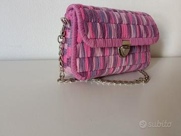 borsa realizzata a mano in fettuccia a sfumare rosa lilla, chiusura a cartella tracolla in catena , possibile sostituire tracolla se si preferisce