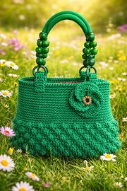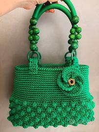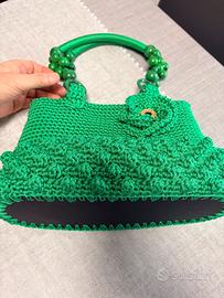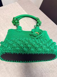 Barsa artigianale di color verde fatta totalmente a mano con cordino, rifinita nei minimi dettagli, con fondo rigido, foderata con tessuto Missoni, con manici in legno e cordino abbinati. La borsa misura altezza 22 cm, con manici 42 cm. Circonferenza 82 cm