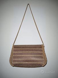 borsa artigianale cucita a mano in cordino su rete canvas. Misure: larghezza 28cm, altezza 17cm, profondità 8cm, lunghezza tracolla 85cm. Colore marrone chiaro e scuro.