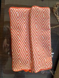 Borsa artigianale fatta a mano, nuova senza cartellino. Fantasia geometrica nei toni corallo/arancio e bianco, originale e luminosa. Chiusura con zip, pratica e capiente per l’essenziale.