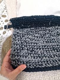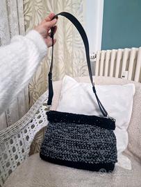 Borsa a tracolla artigianale, realizzata a mano con cura. Color nero e grigio. Lana con paillettes e fondo in cordino. Organizer interno. Completa di tracolla lunga. Misure 35x25 cm.