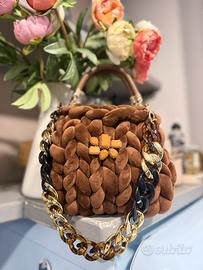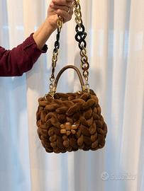 Bellissima borsa realizzata interamente a mano, con intreccio morbido color marrone caldo dall’effetto vellutato, curata in ogni dettaglio.