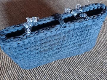 Vendo borsa di media grandezza realizzata a mano con fettuccia grigia, con doppia catena a maglie di plastica trasparente e chiusura con grosso elemento decorativo. Le condizioni sono pari al nuovo.
