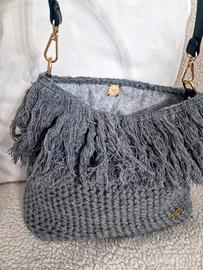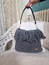 Borsa in lana artigianale, realizzata a mano con cura. Colore grigio lavorata all'uncinetto con un design moderno e dettagli unici. Lana con frange, foderata in panno grigio, base in pelle, misura 31x23 cm