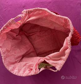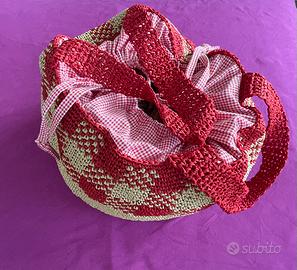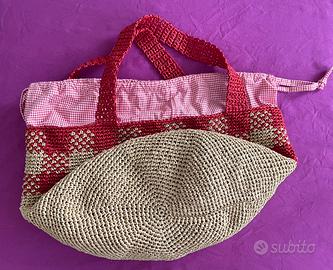 Borsa artigianale (lavorazione all’uncinetto) in rafia (colori: giallo tenue e rosso) e cotone (vichy bianco e rosso). Capiente, perfetta per tempo libero/mare. Nuova, mai usata.