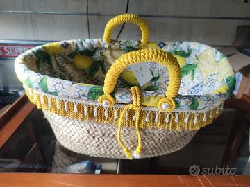 Borsa artigianale in tessuto e paglia intrecciata e dipinta a mano su pelle, raffigurante Ischia (Campania). provenienza isola di Ischia. Lavorata a mano da abili artigiani locali. Internamente rivestita in cotone 100% con disegnato pinte di limone, finemente arricchita. manici rivestiti e chiusura con bottone sferico in ceramica. Passamaneria, applicazioni perline tonde e a goccia e con fascia in pelle dipinta a mano della veduta di Ischia.