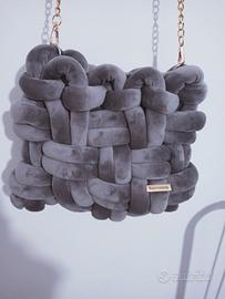 borsa realizzata a mano con filato marshmallow, colore grigio particolare lavorazione, abbastanza capiente e comoda ,tracolla in catena con salva spalla grigio.