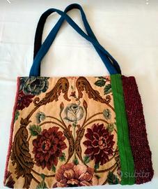 Tote bag a spalla o a mano interamente realizzata artigianalmente in stoffa tipo tappezzeria,cotone e nastri di maglia,tasca interna,chiusura con moschettone.Misure indicate nelle ultime 3 foto.Possibile vendita diretta Napoli zona Posillipo