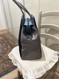 Borsa da donna blu e azzurra metallizzato, con parte frontale in cavallino operato coccodrillo e la parte posteriore in cavallino liscia. La borsa è molto capiente e di effetto, sicuramente unica anche perché è artigianale. Le condizioni sono ottime senza segni nella pelle o nei manici. La fodera è a righe blu e azzurra . Due ampie tasche con tasca centrale a zip.