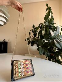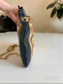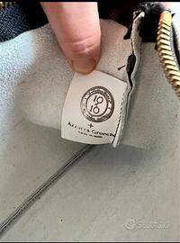 Tracolla a catena dorata rimovibile, chiusura superiore con zip e interno in pelle scamosciata chiara.