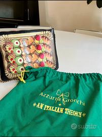 Borsa Azzurra Gronchi x An Italian Theory, edizione limitata made in Italy, in pelle nera, con originale stampa di pasticcini italiani sul fronte.
