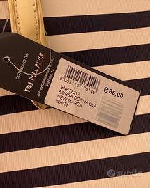 All'interno anche tracolla per indossarla a spalla. Colore bianco a righe blu. Borsa molto elegante ma al tempo stesso sportiva, da sfoggiare in ogni occasione. Disponibile per altre foto dimensioni 28 lung- 24 alt-15 prof.