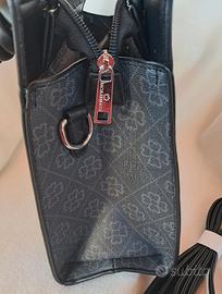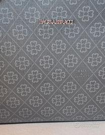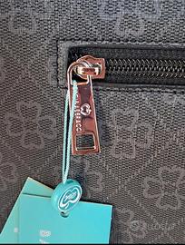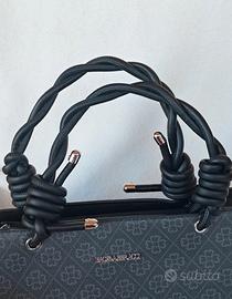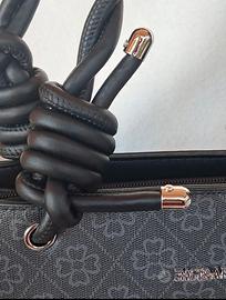 Borsa a mano e tracolla Colori grigio e nero Motivi floreali Doppi manici intrecciati e annodati alle estremità Disponibile anche la tracolla regolabile Chiusura con cerniera All'interno 3 scomparti: uno con cerniera due aperti Tasca posteriore con cerniera. Dettagli metallici color argento Misure: Lunghezza cm 32 Altezza cm 25,5 Profondità cm 10 Logo presente in più punti: parte frontale, tiretti delle cerniere esterne, fodera Marchio: Baci e Abbracci Non ho la dust bag