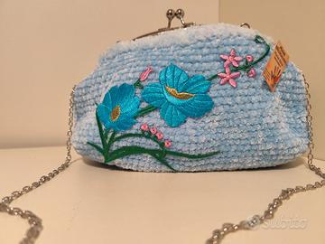 Questa borsa esclusiva è realizzata a mano in velluto azzurro, perfettamente foderata all'interno ed impreziosita da una magnifica decorazione floreale ricamata nei toni del giallo e arancio con dettagli verdi.