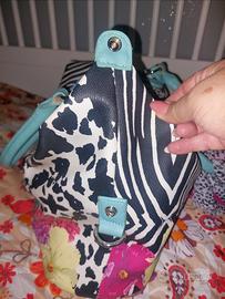 La borsa presenta una combinazione di stampe animalier e floreali.I pannelli principali sono caratterizzati da macchie di leopardo in bianco e nero e strisce zebrate. I manici sono di un vivace color turchese/azzurro.La parte inferiore della borsa include applicazioni floreali decorative nei toni del rosa e dell'azzurro.