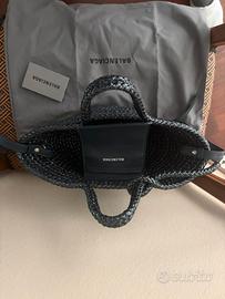 Borsa Balenciaga nuova modello Ibiza basket in ragia sintetica lucida con tracolla e taschino in pelle color antracite. Mai stata indossata. Completa di dustbag e cartellino esplicativo. Cm28 (manici compresi), larghezza all’apertura cm34, base quasi tonda cm13x14