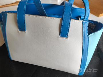 I manici corti e il bordo superiore della borsa sono leggermente usurati e in qualche punto l'azzurro è venuto via, ma le condizioni sono comunque discretamente buone.
