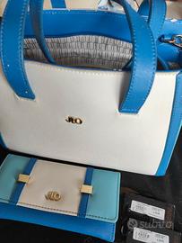 Borsa bianca e azzurra JLo completa col suo portafogli.