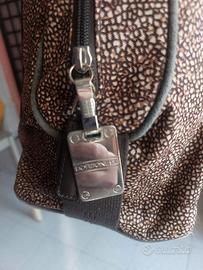 Bauletto firmato Borbonese, caratterizzato dall'iconica stampa Occhio di Pernice (OP) su tela o nylon con due manici in nastro di nylon logato a jacquard che avvolgono il corpo della borsa.