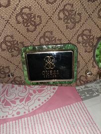 borsa bauletto Guess, marrone e verde,portachiavi,manici, è tracolla,pelle di rettile