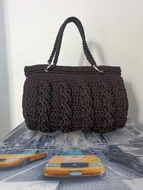 Borsa modello bauletto realizzata a mano all'uncinetto in cordino marrone con motivo trecce.