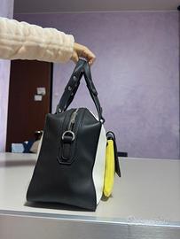 La borsa si distingue per il suo design moderno "color block" a tre colori: corpo centrale bianco, profili e manici neri, e un vivace tocco di giallo sulla tasca frontale.
